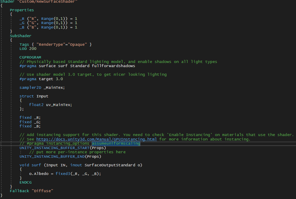 프로퍼티에서 인스펙터에 rgb값을 정할 bar를 만들고 구조체 아래에서 각 값을 변수로 선언했으며 surf 내에서 bar의 값에 따른 rgb값을 연동해주었다.