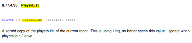 방 안에서의 다른 플레이어들 정보를 얻으려면 이 기능을 이용해야한다. 다만, []를 보면 알겠듯이 배열이기때문에 foreach나 for문 등의 반복문을 사용하여 Player값을 얻어야한다.
