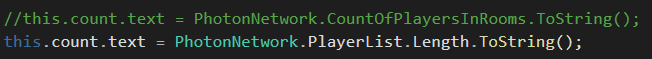PhotonNetwork.PlayerList.Length 는 현재 방에서의 플레이어 수를 타내는 코드이다.