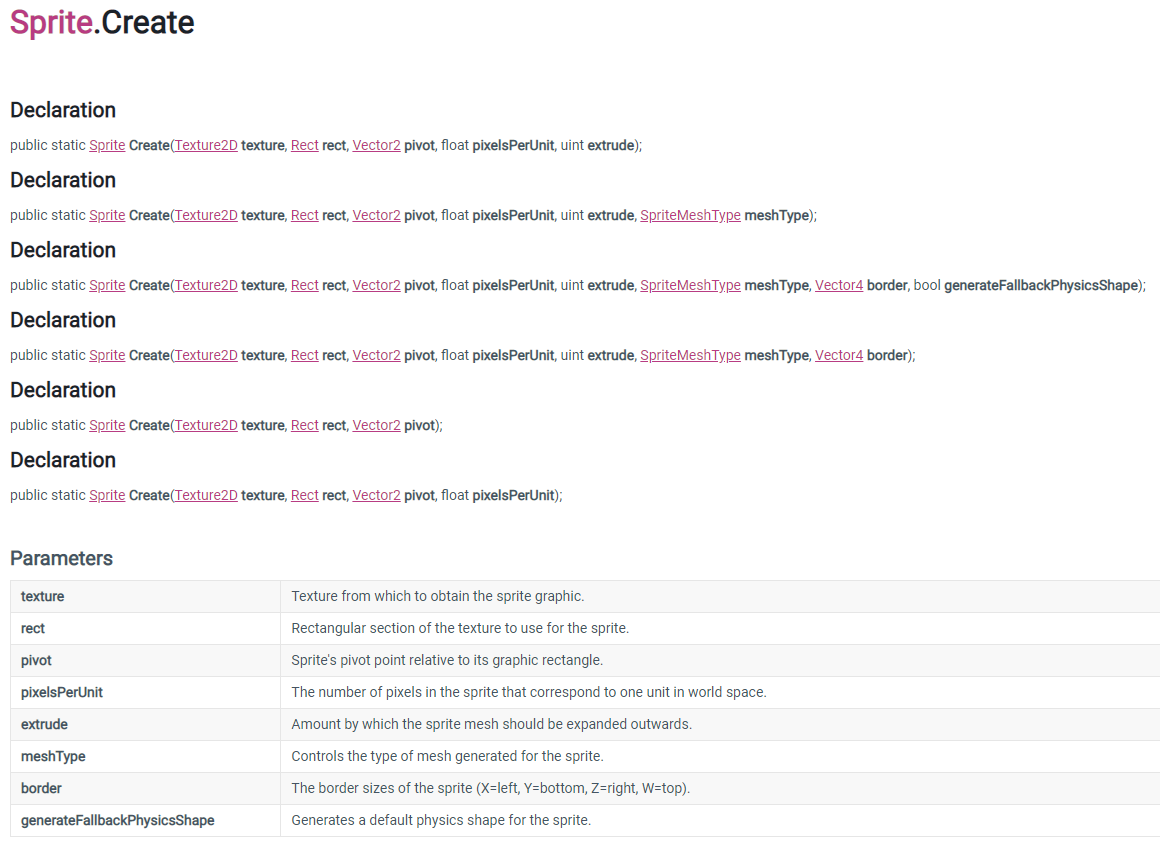 Sprite.Create creates a new Sprite which can be used in game applications. A texture needs to be loaded and assigned to Create in order to control how the new Sprite will look. In the script example below a new Sprite is displayed when the button is presse
