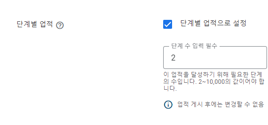 이런 단계별 업적을 사용하기 위해서는 Google Play Console에서 업적을 생성할 때 단계별 업적으로 설정한 뒤 단계가 얼마나 있는지도 지정해주어야한다.
