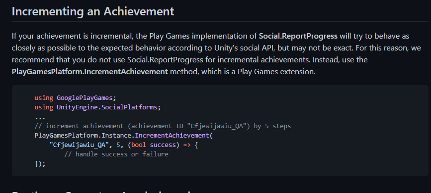 PlayGamesPlatform.Instance.IncrementAchievement(GPGSIds.achievement, 1, (bool success) => {