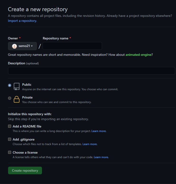 - 그러면 위 사진과 같이 여러 항목들이 뜨는데, Owner와 Repositoryname만 기입한다면 괜찮다.