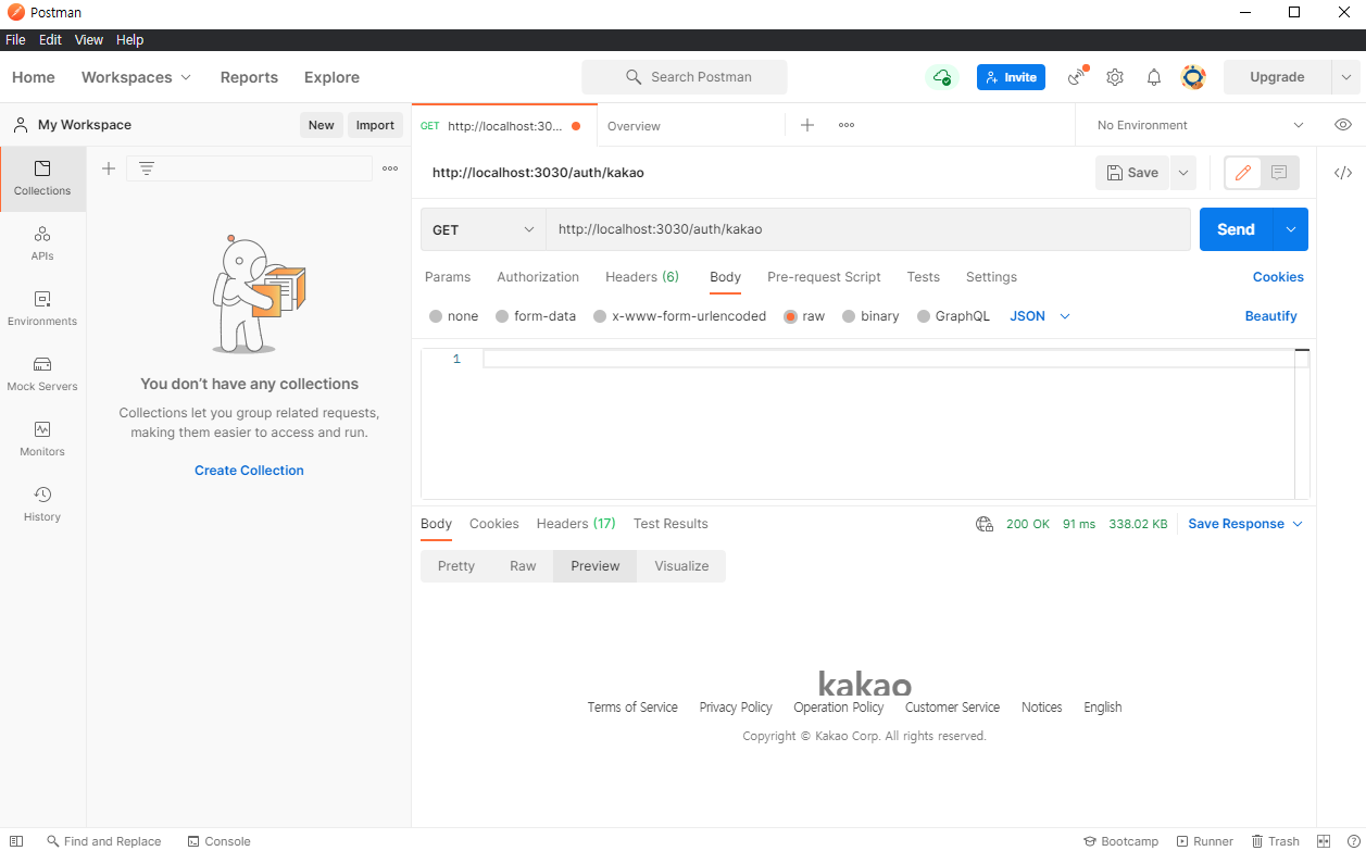 - 위의 코드를 작성하고 웹페이지에서 url/auth/kakao를 하면 아이디, 닉네임, 썸네일 url이 포함되 JSON데이터가 출력될것이다.