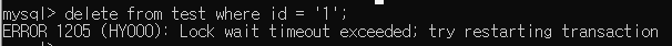 - cmd에서 실행중인 해당 mysql은 권한이 없는 상태이므로 (B상태임) test쿼리를 수정하려 해도 트랜잭션으로 인해 잠겨있어 시간을 초과했다고 나온다.