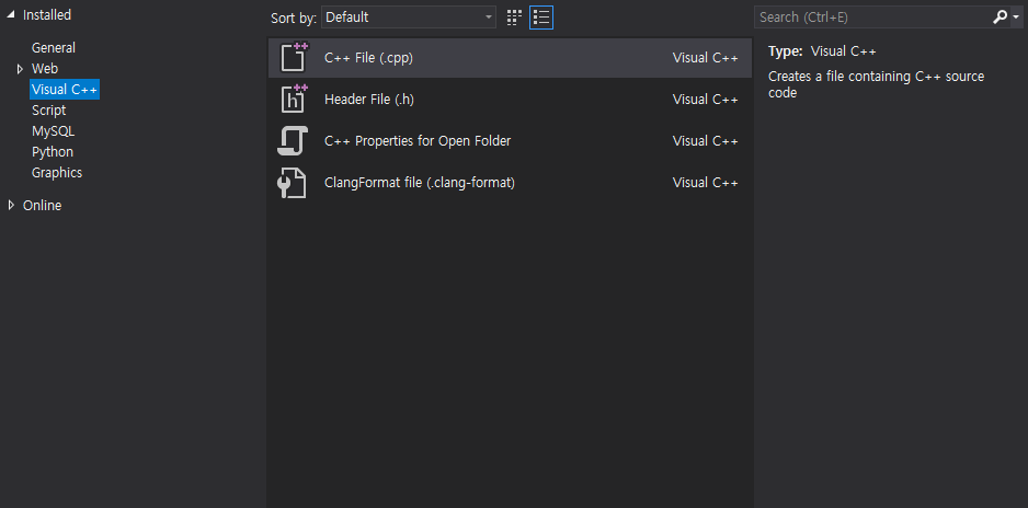 ** Visual C++탭 > C++ File 을 생성해주었습니다.