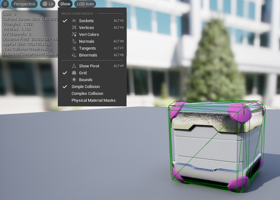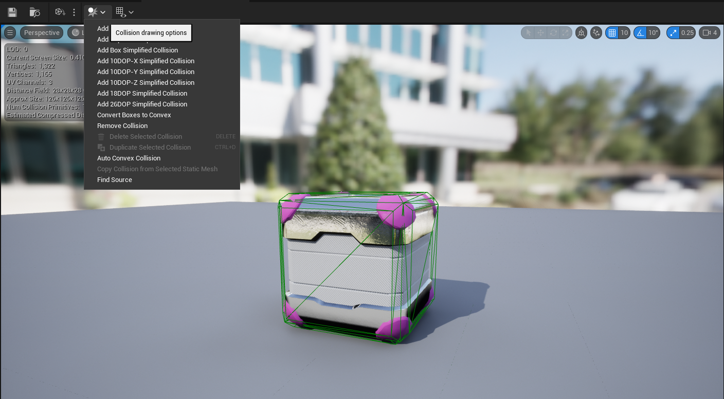 모델을 더블클릭하여 들어가 뷰포트 상단의 Collision에서 간단한 Collision을 심어주면 해결됩니다.