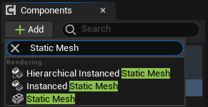 Component를 검색하여 추가할 때, Static Mesh를 추가하면 최상단엔 Hierarchical Instanced Static Mesh가 나오고, 3번째에 Static Mesh가 나옵니다.