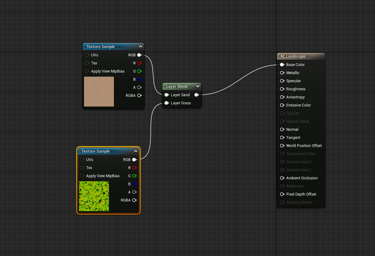이것을 Sand라고 명명하고 연결하지 않은 상태로 두면 Layer Blend에서 우리가 만든 Sand 노드와 연결할 수 있게 됩니다.