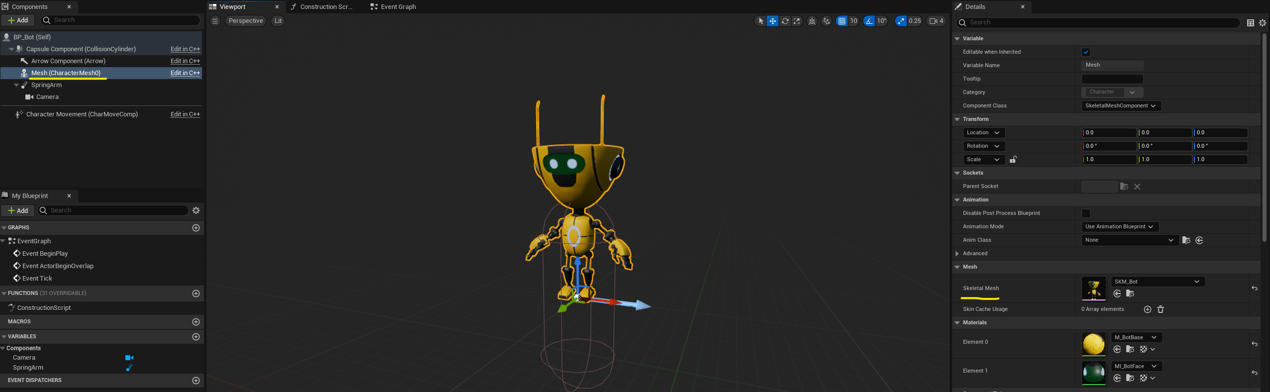 BP_Bot으로 돌아가서 우리가 만든 이 캐릭터를 Skeletal Mesh에 추가할 수 있습니다.