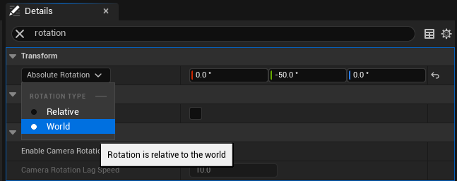 Details > Transform의 Attach된 대상 설정을 Relative -> World로 변경해줍니다.
