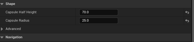 캡슐의 높이 지름(Half Height)를 70으로, 둘레(Radius)를 25로 설정해줍니다.
