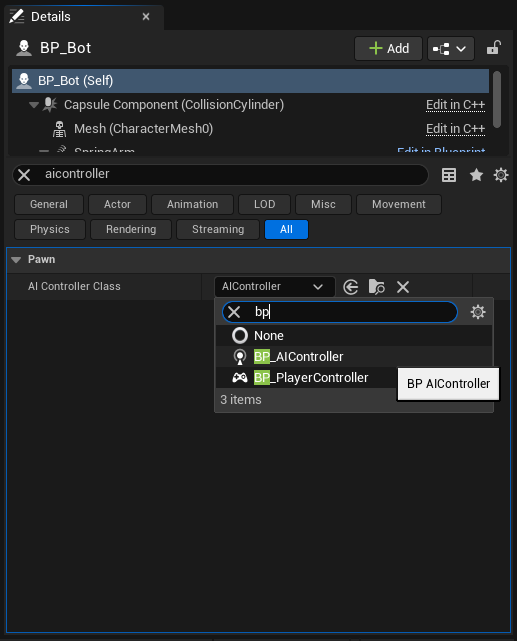 현재는 PlayerController가 봇을 제어하도록 설정되어 있으니 AI Controller도 봇을 제어할 수 있도록 사용할 수 있습니다.