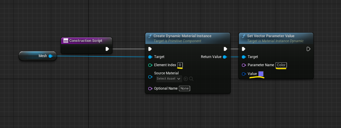 Contruction Script는 Create Dynamic Material Instance와 연결합니다.