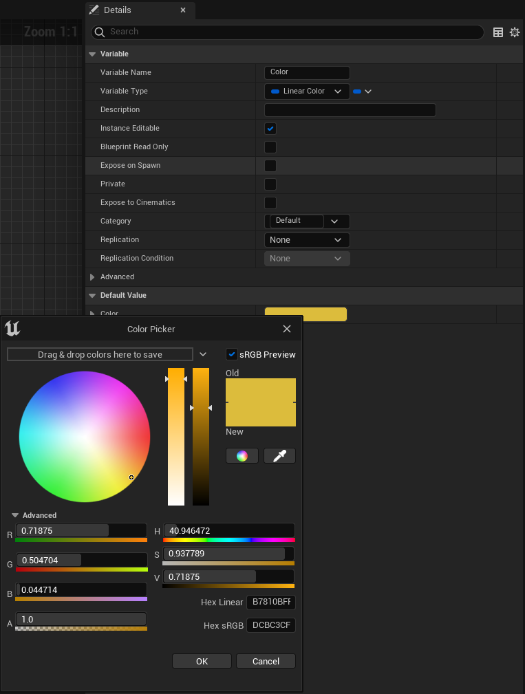 * 만약 Color변수의 Color Picker가 보이지 않는다면 Compile을 하면 나타납니다.