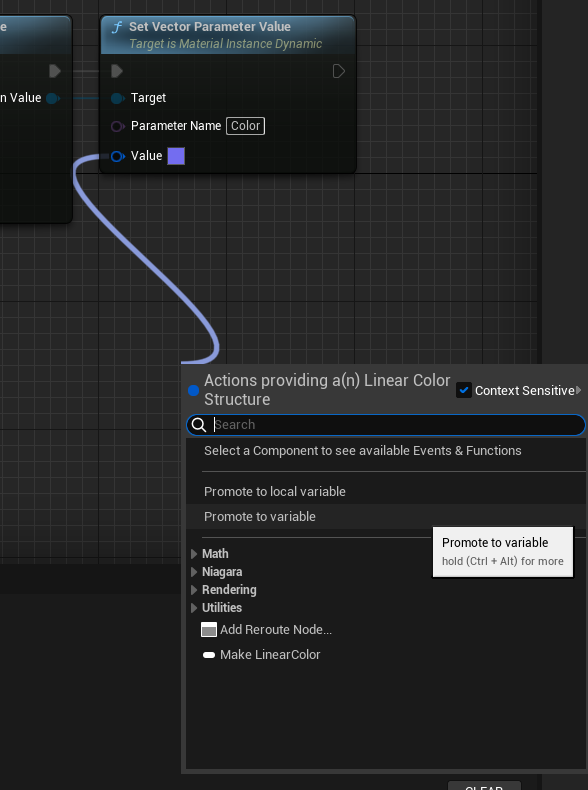 따라서 SEt Vector Parameter Value의 Value를 드래그하여 변수로 승격시켜주고 Color로 명명합니다.