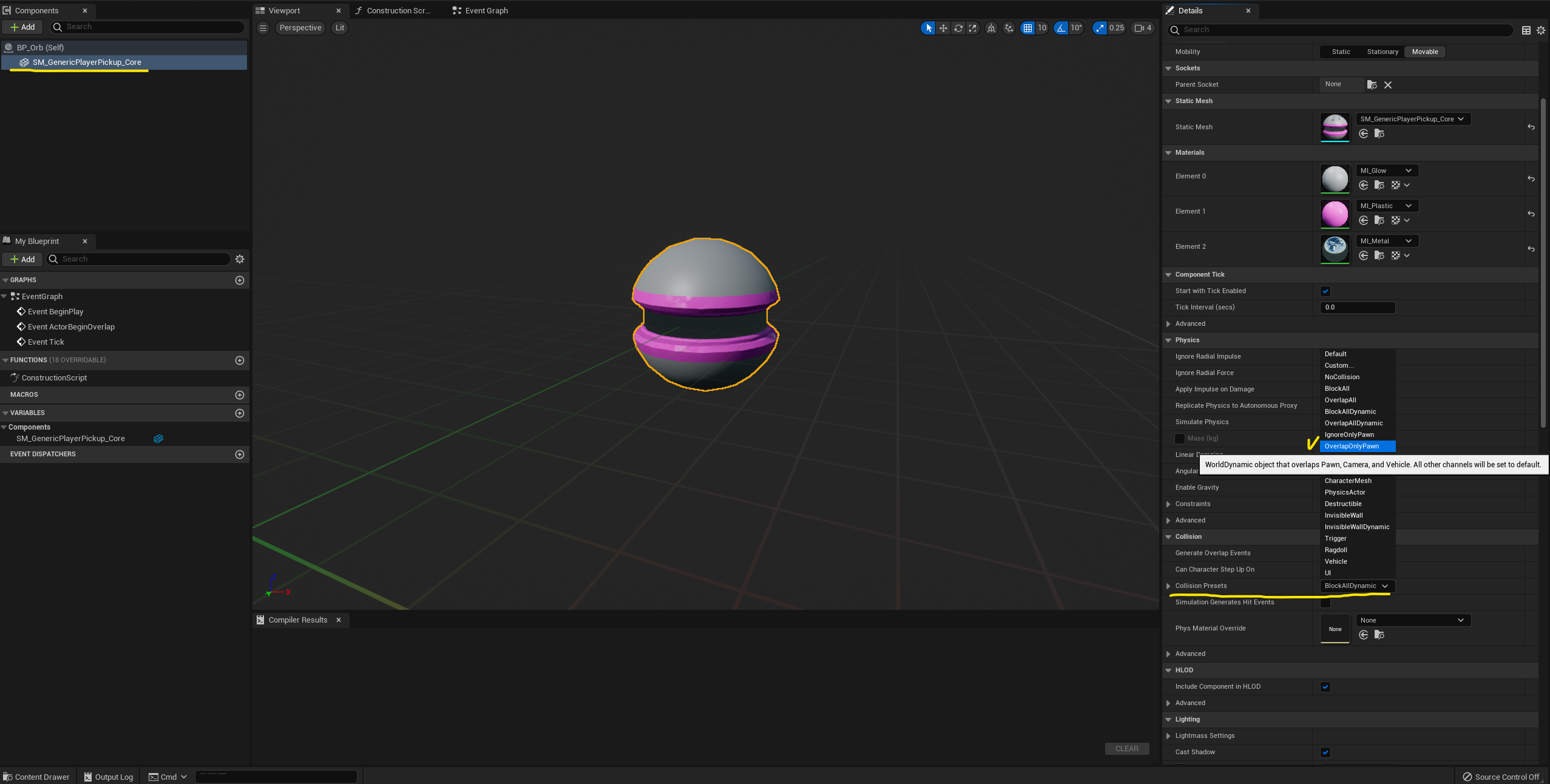 BP_Orb > StaticMesh > Add Event > Add OnComponentBeginOverlap을 선택합니다.