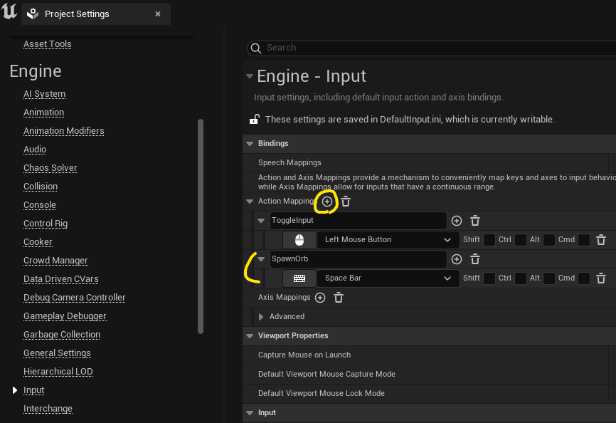 Project Setting > Engine > Input 에서 Action Mappings를 추가하겠습니다.