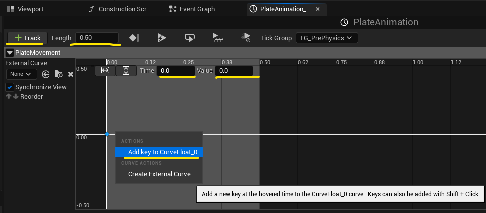 키를 하나 추가하여 Time = 0.5 Value = 1.0으로 설정합니다.