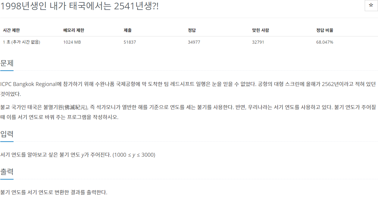 (Python/C#/C++) 백준 18108번 - 1998년생인 내가 태국에서는 2541년생?!