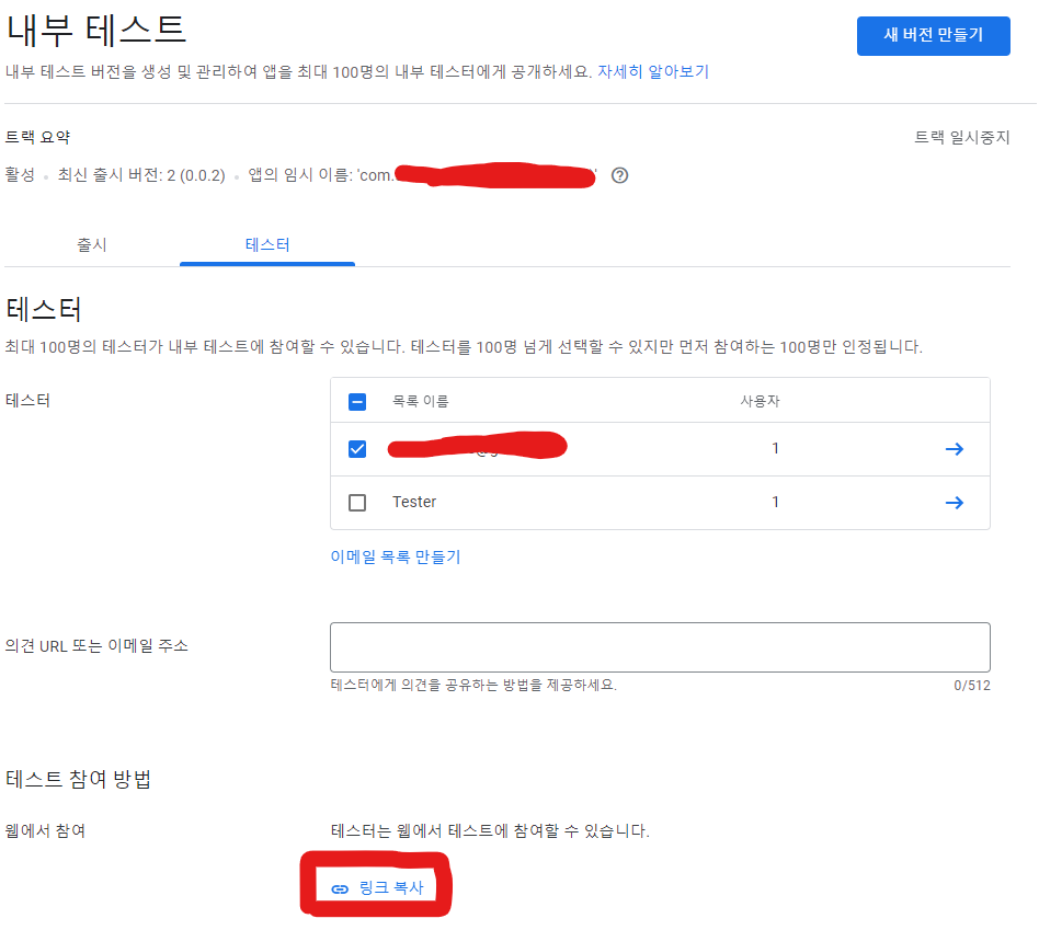 위 사진처럼 내부/비공개 테스트에서 테스터로 지정했다면 '링크 복사'를 통해 테스터 참여 링크를 배포할 수 있다.