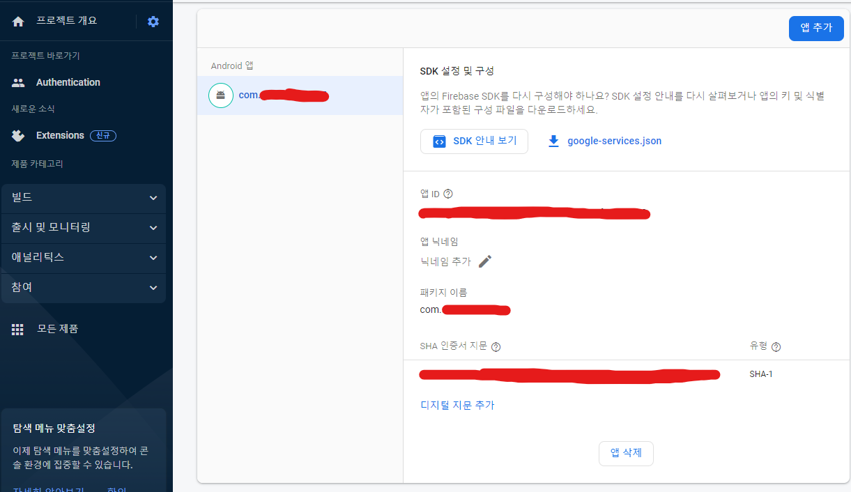- Firebase > 프로젝트 설정 > 내 앱 > 디지털 지문 추가 > SHA-1지문 추가