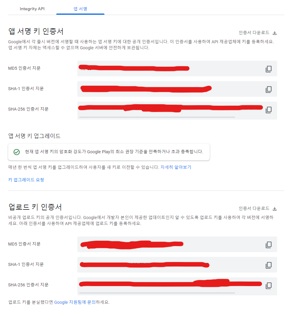 앱서명 키는 Google Play Console > 프로젝트 > 설정 > 앱 무결성 에서 확인이 가능한데, 이는 내부테스트 또는 비공개 테스트를 한 번 이상 출시해야 앱 서명 키가 생성됨.