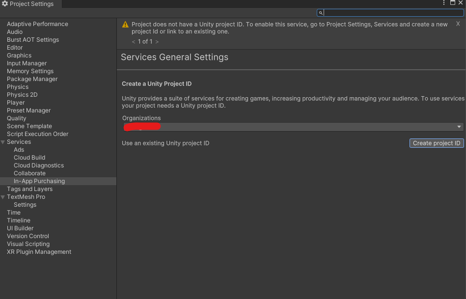 나온 Services탭에서 In-App Purchasing을 선택하고 조직을 정하고 프로젝트 ID를 생성합니다.