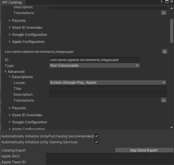 마찬가지로 제품 ID를 Unity IAP 카탈로그의 상품 ID와 일치시켜주시고 이름은 적절히 지어주세요.