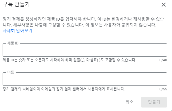 '상품 만들기'를 클릭하고 열린 페이지에서 제품 ID는 우리가 Unity의 IAP Catalog에서 작성한 상품의 ID와 완벽히 일치해야합니다.