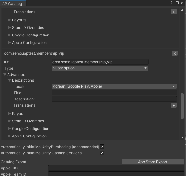 그리고 아래쪽에 있는 자동 초기화 옵션을 둘 모두 켜주는게 좋습니다. 특히 UnityPurchasing초기화는 코드로 초기화할 것이 아니라면 꼭 체크해주세요.