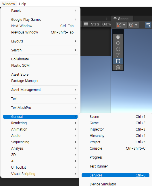 Unity 프로젝트에서 Ctrl + 0을 눌러주세요 그럼 Services 창이 뜰겁니다.