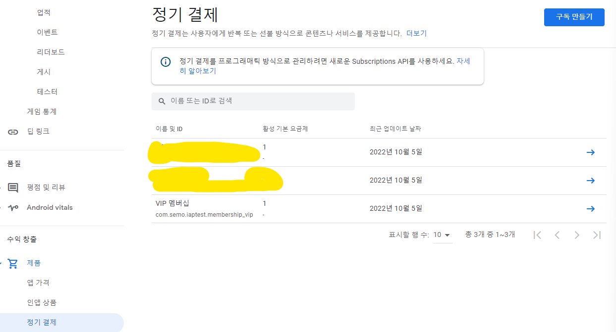 이제 Google Console에서 수익 창출 > 제품 > 정기결제 탭으로 들어가 '구독 만들기'를 눌러주세요.
