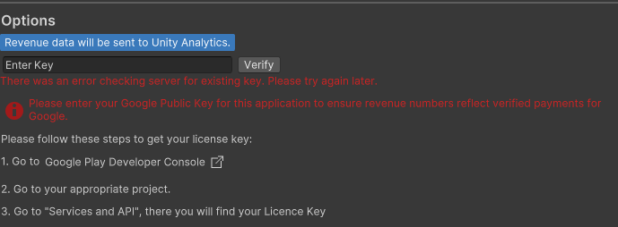 이것은 Google Play Console의 라이센스 키를 할당하면 사라집니다.