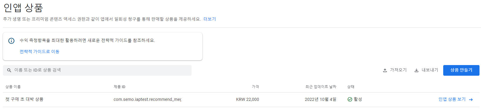 프로젝트를 등록한 앱을 선택하고 수익 창출 섹션 > 제품 > 인앱 상품 으로 들어가서 상품을 만들어야 합니다.