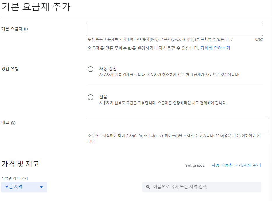ID는 적절히 지어주시고 여러 설정들을 맘에 들게 맞춰주세요. 그리고 가격설정을 해주시고 저장 - 활성화 해주시면 구독상품이 만들어져서 활성화됩니다.