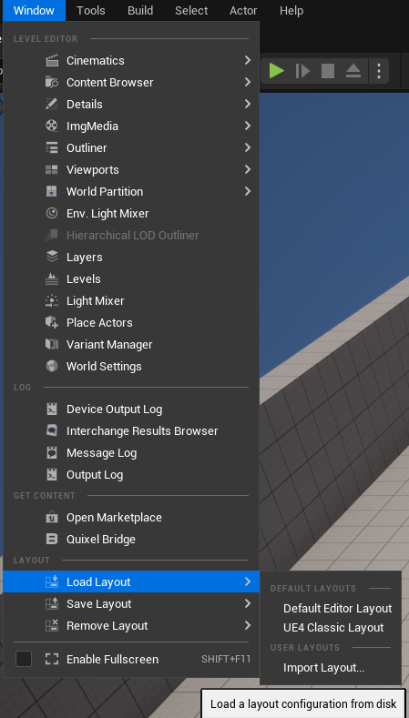 Window > Load Layout에는 UE5에서 지정해둔 레이아웃 프리셋이 두개 있다. UE4사용자여서 UE4 레이아웃이 편하다면 UE4 Classic Layout을, UE5의 레이아웃을 사용하고 싶다면 Default Editor Layout을 사용하면 된다.