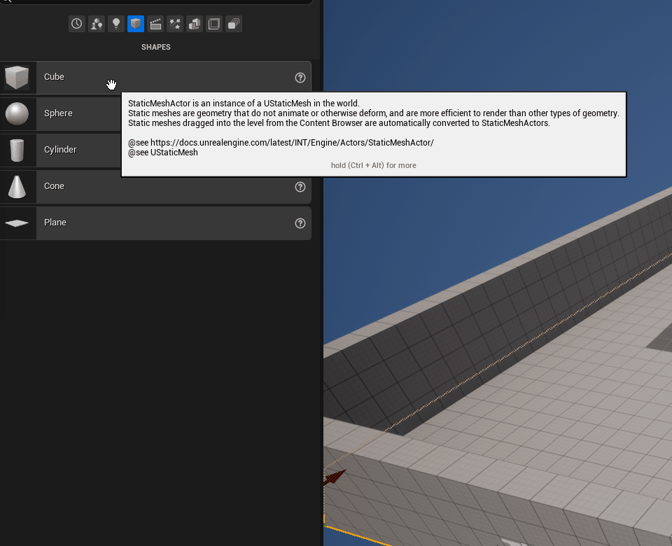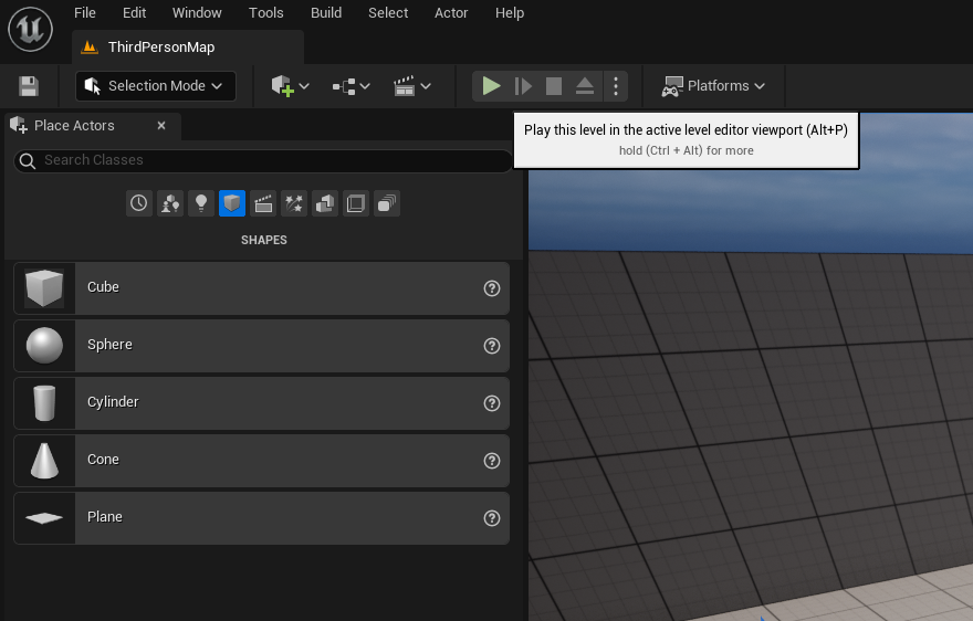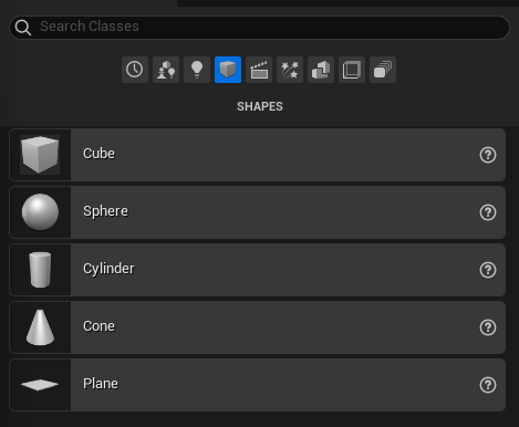 예를 들어보자면, Place Actor 패널을 보면 위쪽에 여러 카테고리가 존재하는데, Shapes를 뜻하는 정육면체 모양의 아이콘을 눌러주자.