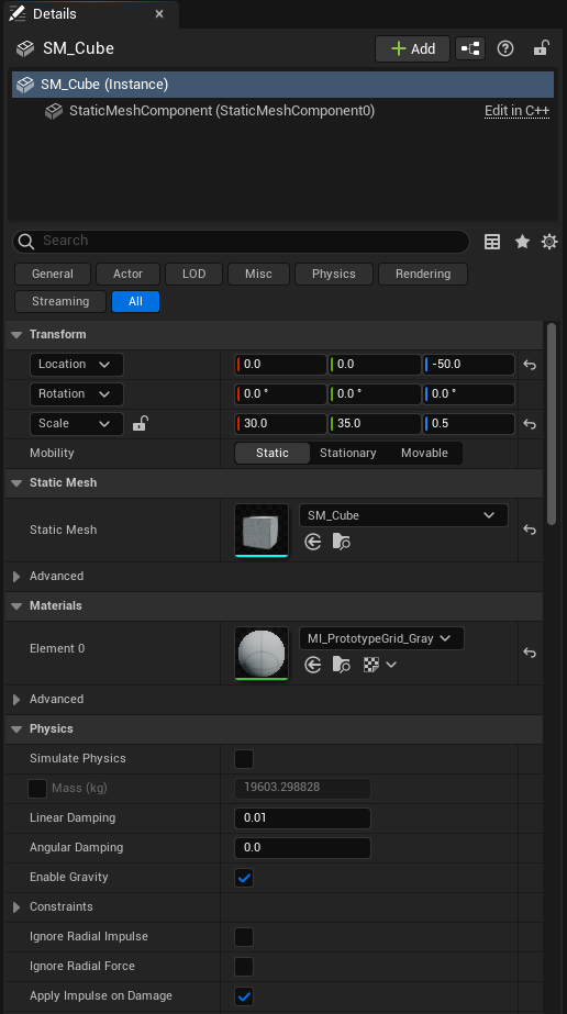 그리고 UE4, UE5 기본 레이아웃 모두 Viewport 바깥의 우하단을 보면 Details라는 패널이 존재하는데, 여기는 Actor의 상세정보가 표기되는 곳이다.