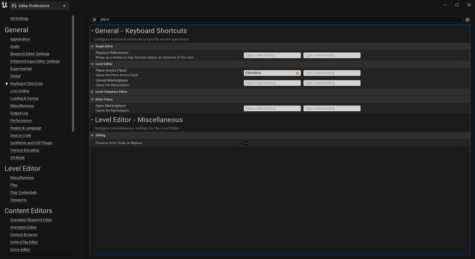 Place Actor 패널을 열면 위 사진과 같은 모습이 나오며, 매번 클릭으로 눌러 열긴 귀찮을 듯 하여 키보드 단축키를 지정해줬다.