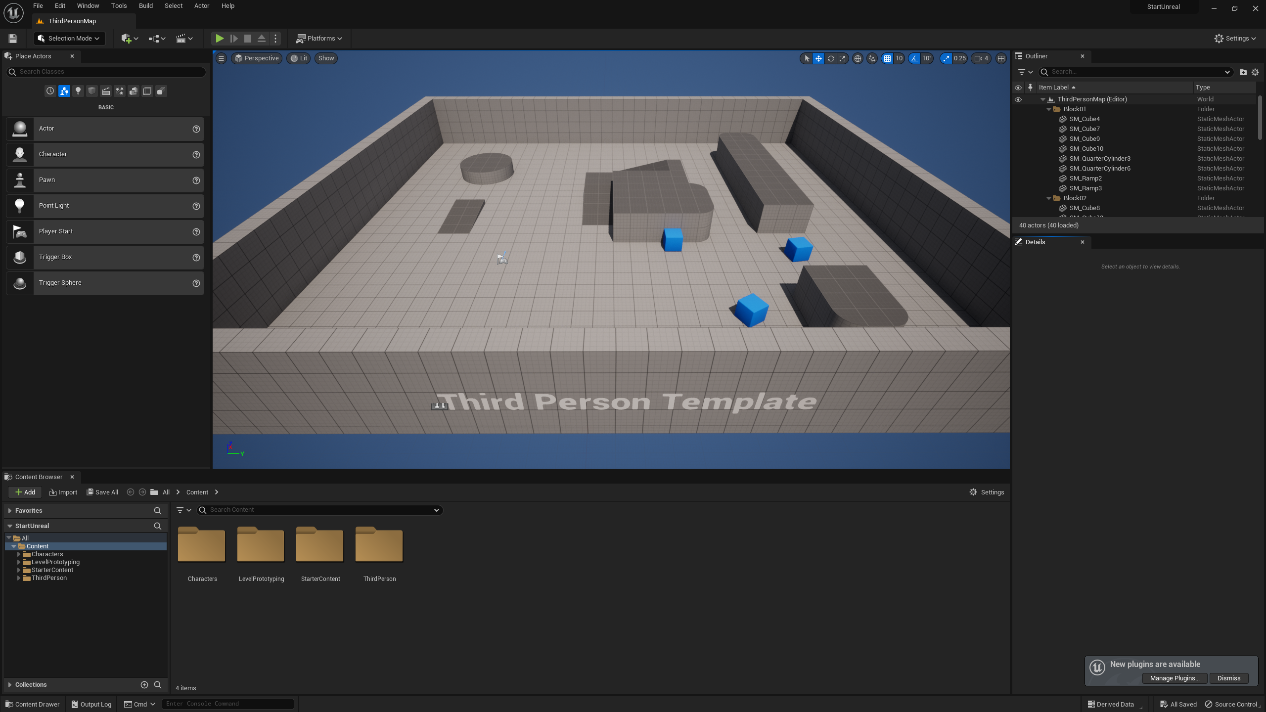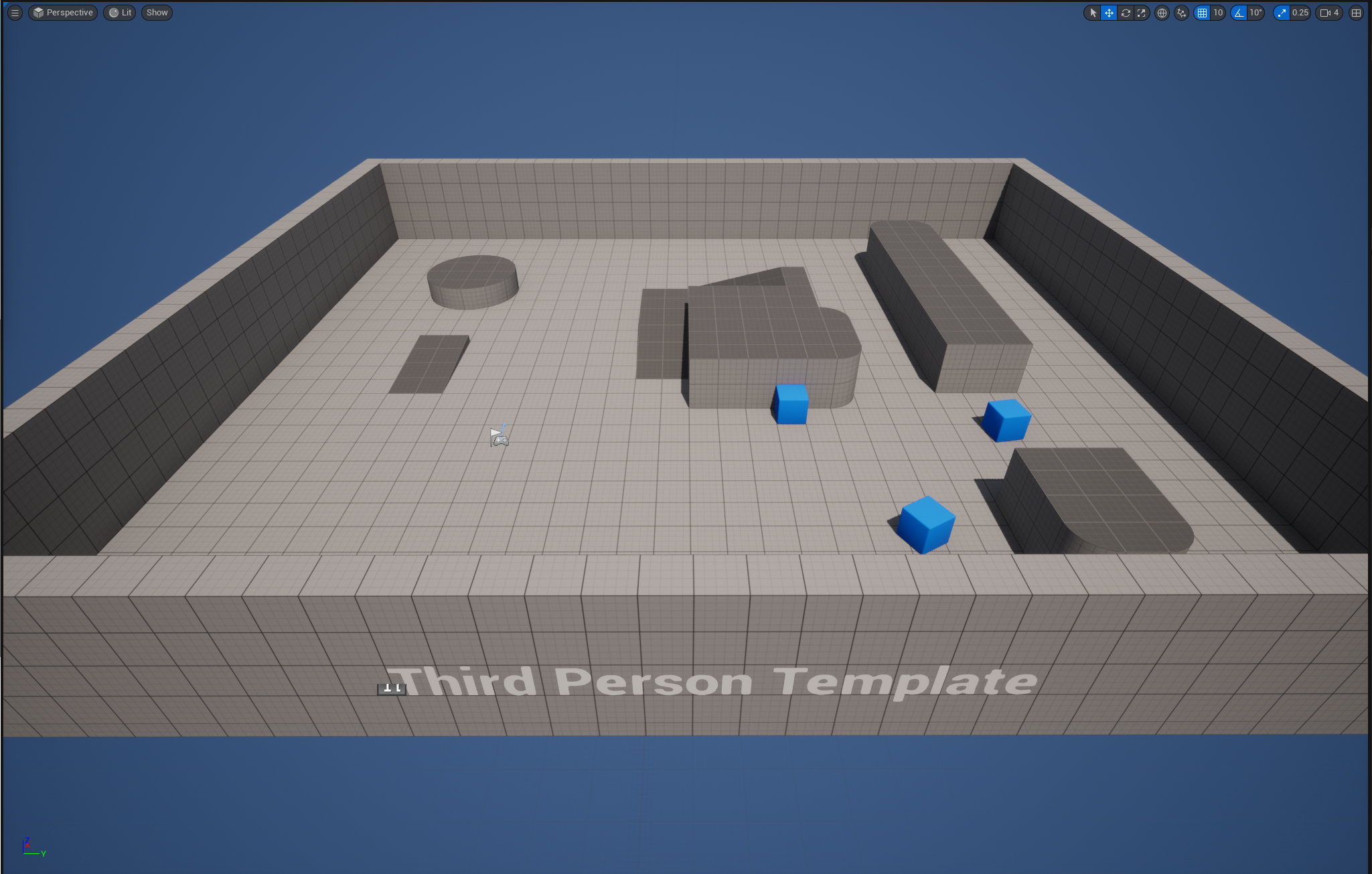 하지만 재생시 캐릭터가 생성되는 점이나, 미리 Actor들이 있던 점, 캐릭터를 WASD와 Space로 조작할 수 있으며 3인칭 시점이 구현된 점은 모두 프로젝트 생성시에 Game > Third Person으로 프로젝트를 생성했기 때문이다. 원래라면 모두 직접 구현해야하는 부분들이다.