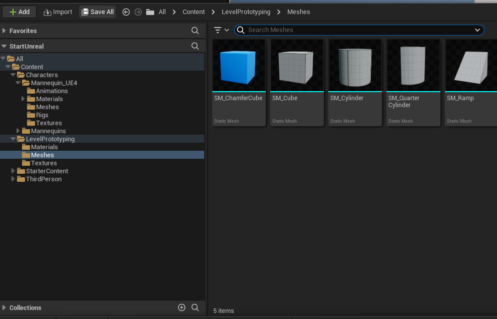 프로젝트에 포함되는 사운드, 모델링 등의 소스들은 Content Browser에 포함되며, 여기서 환경에 배치가 가능해진다.