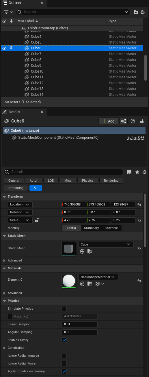 이렇듯 게임 내의 사물들은 기본적인 3D 형태로 표현되는데, 이러한 Actor들을 Outliner에서도 확인할 수 있는데, Static Mesh Actor라고 한다. 그리고 플레이하는 게임들의 사물들은 Static Mesh Actor + Material 가 되어야 완성된다고 할 수 있다.