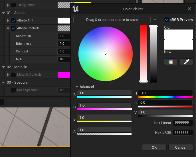 이어서 Albedo Tint를 보자면, Albedo Tint는 에셋의 색상을 나타낸다. 옆에있는 색상칸을 클릭하면 색상 편집기가 나타나고 세밀한 색상값 수정이 가능해진다.