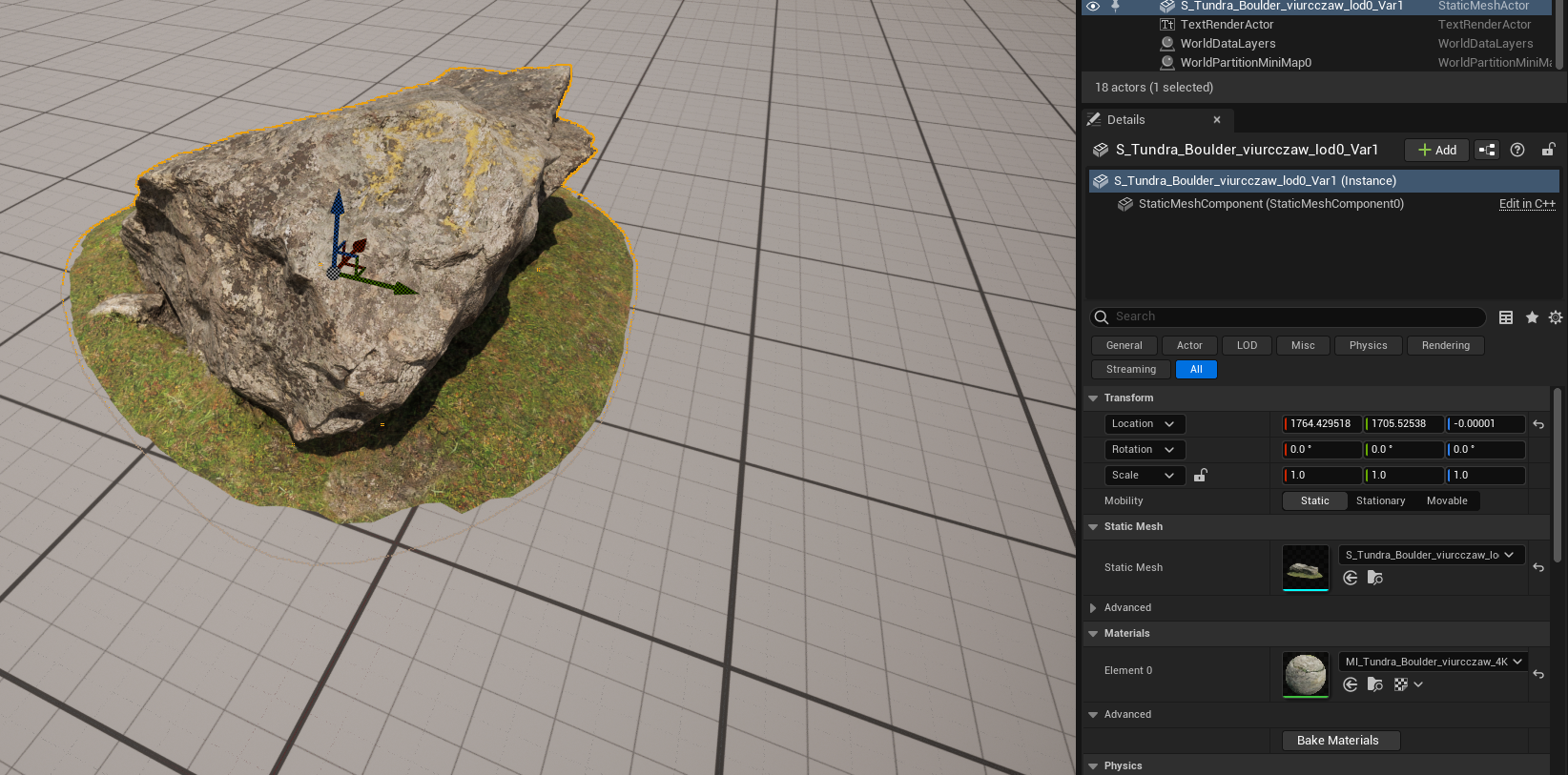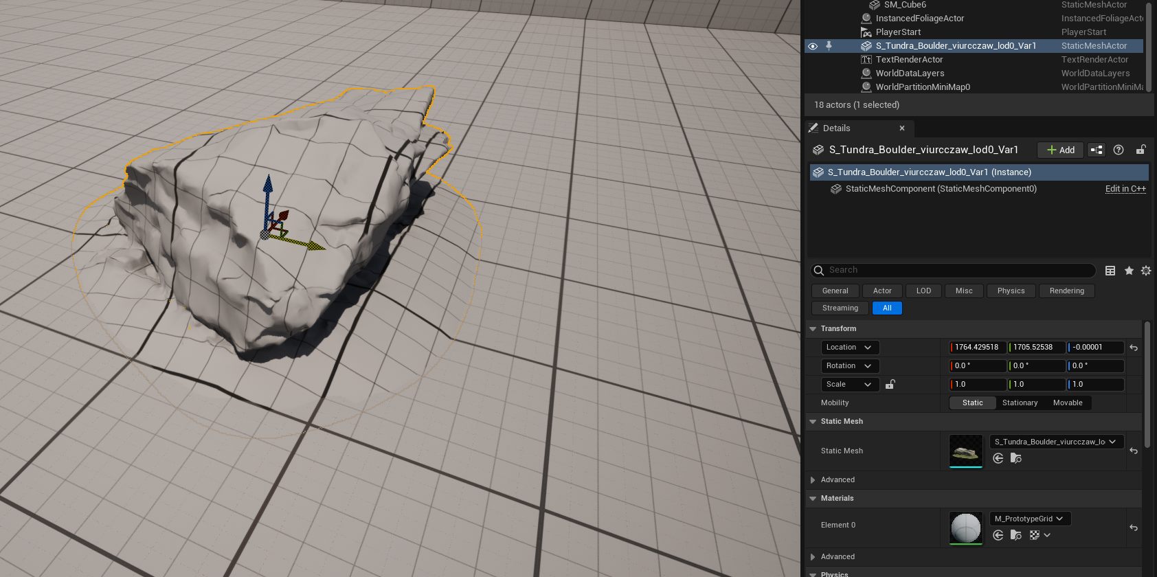 이전에 받았던 Quixel의 에셋들 또한 Static Mesh와 Material이 합쳐져 표현되는 형식이기 때문에 Actor에서 Material을 기본 Material로 변경한다면 오른쪽 사진과 같이 아무런 색이 지정되지 않은 그저 모델링 에셋일 뿐이다.