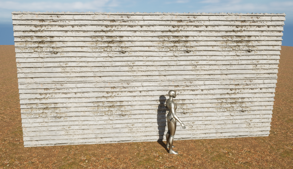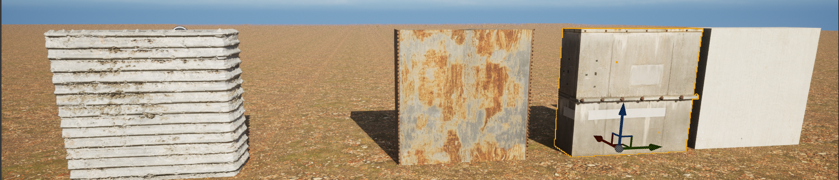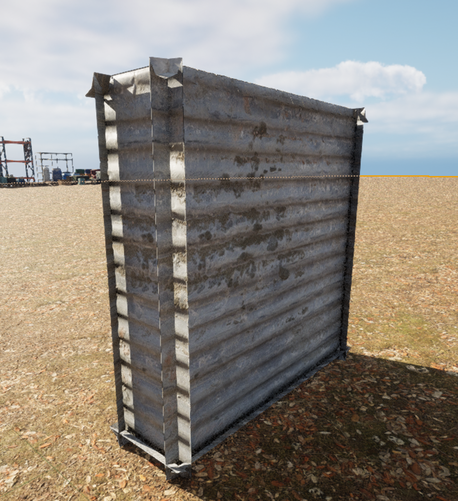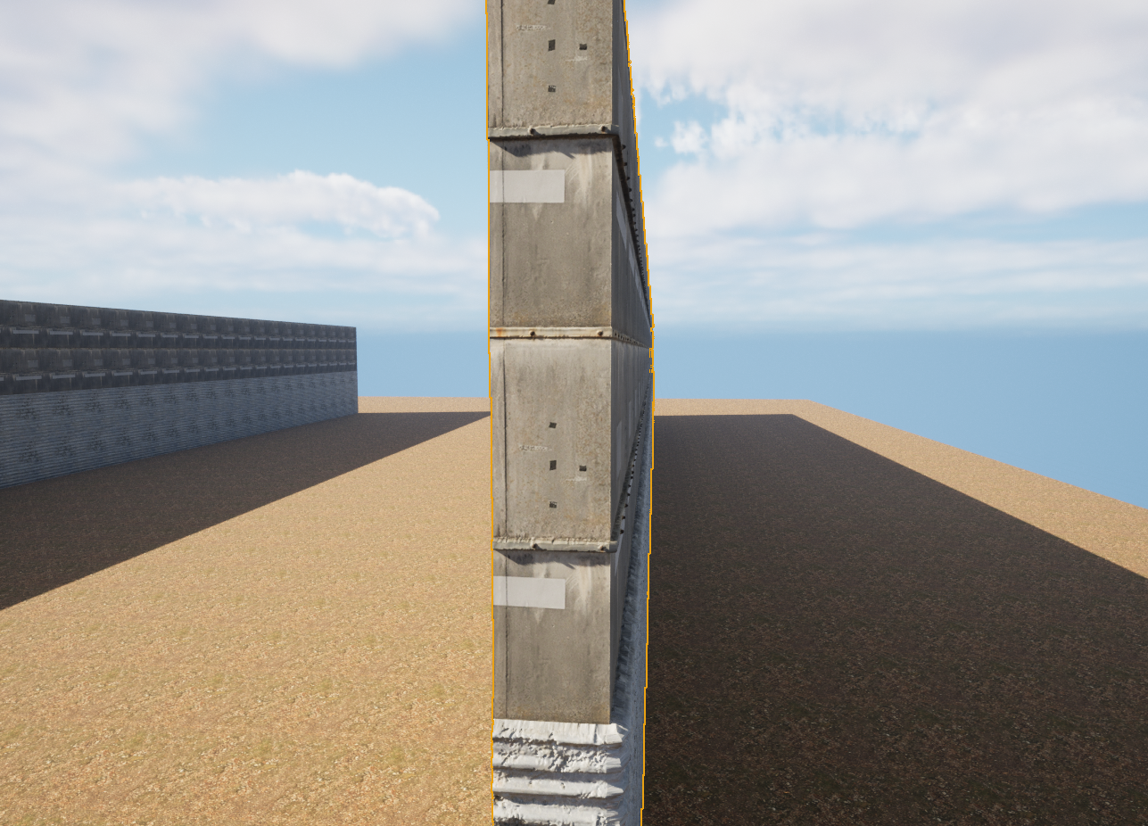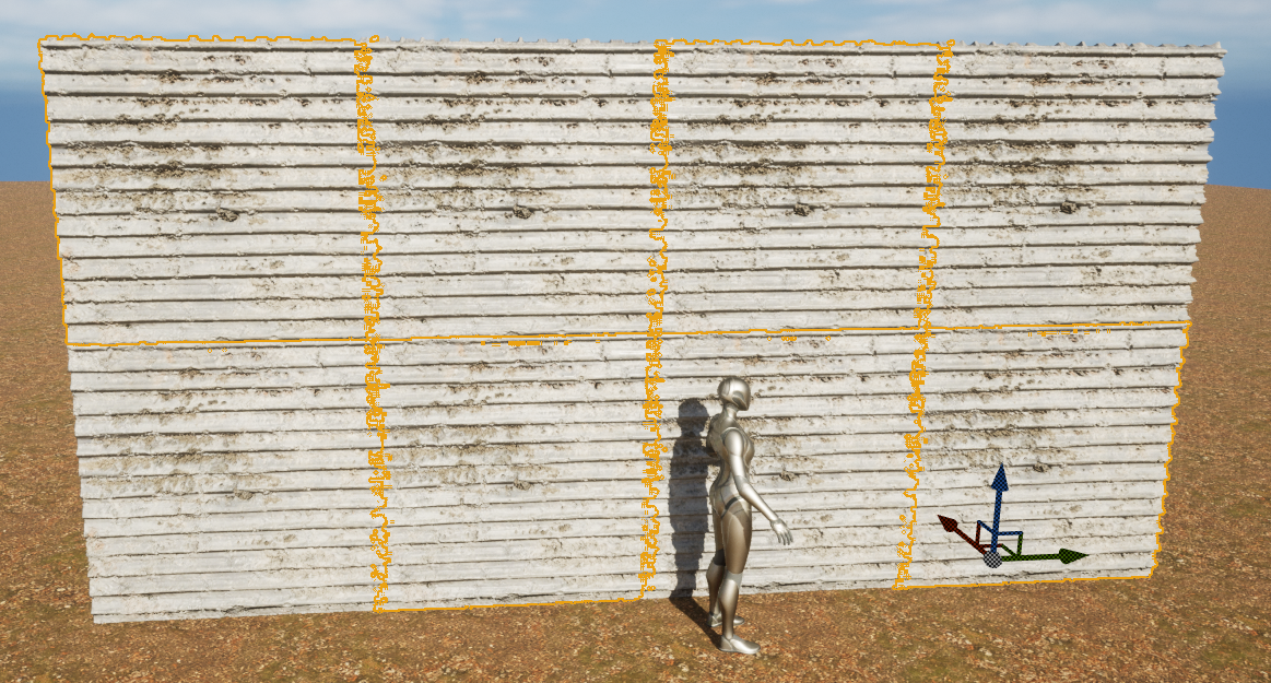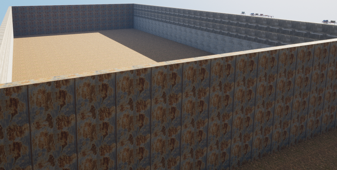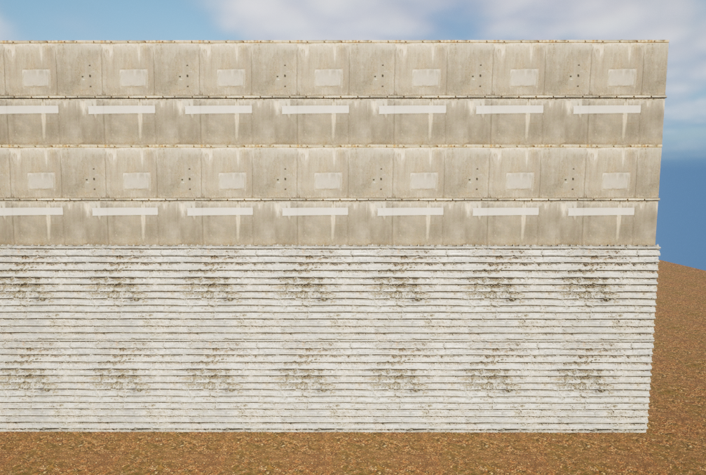 이제 만들어둔 에셋을 늘이고 복사하고 이어붙이며 공장 벽을 세울 수 있다. 하지만 여태까지 작업에서 주의해야 할 점은 ReMesh와 Displace 작업은 Static Mesh의 원본을 수정하게 된다. 따라서 Content Browser를 통해 에셋을 드래그하여 새로운 Actor를 배치한다 하더라도 우리가 수정하여 굴곡을 구현했던 그 모습 그대로의 Actor가 배치된다.