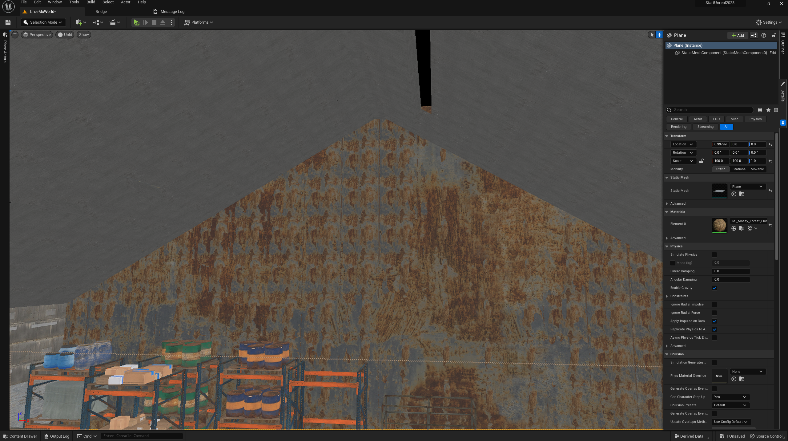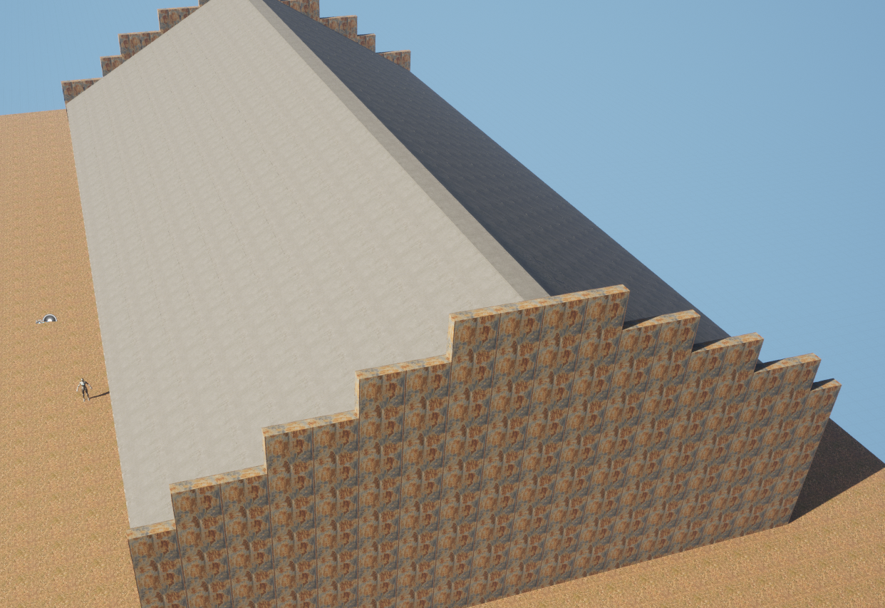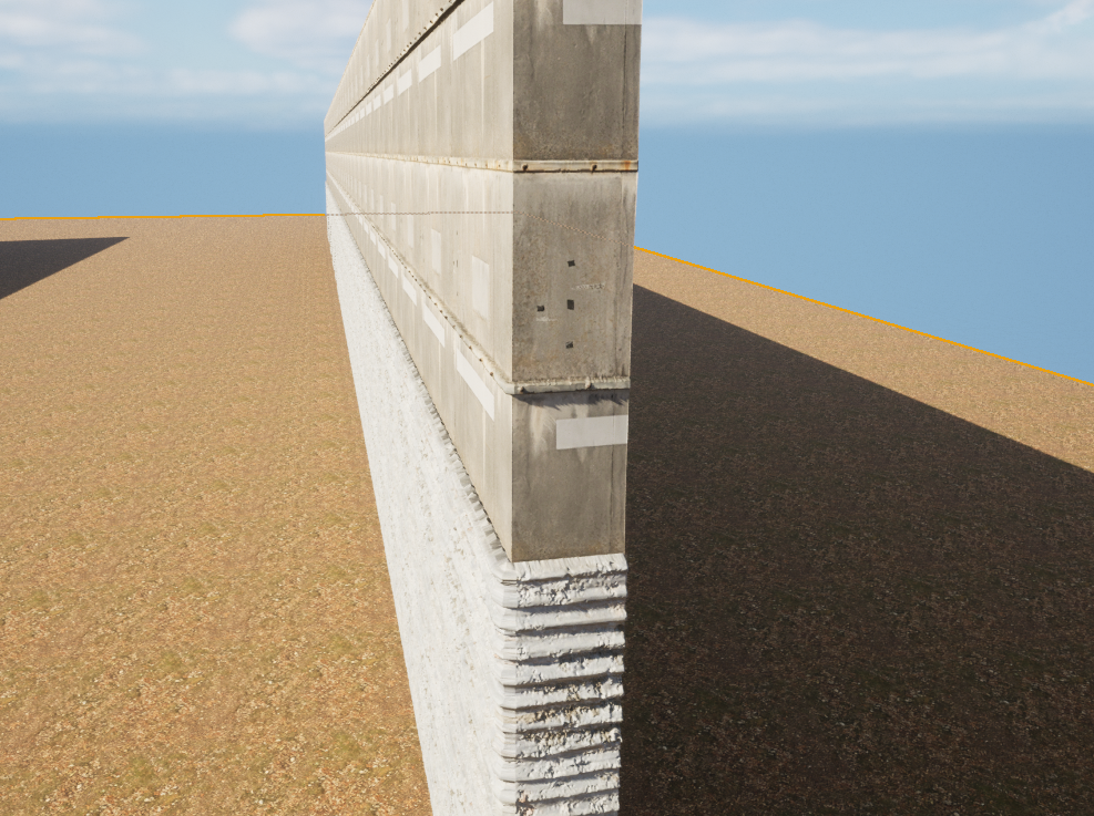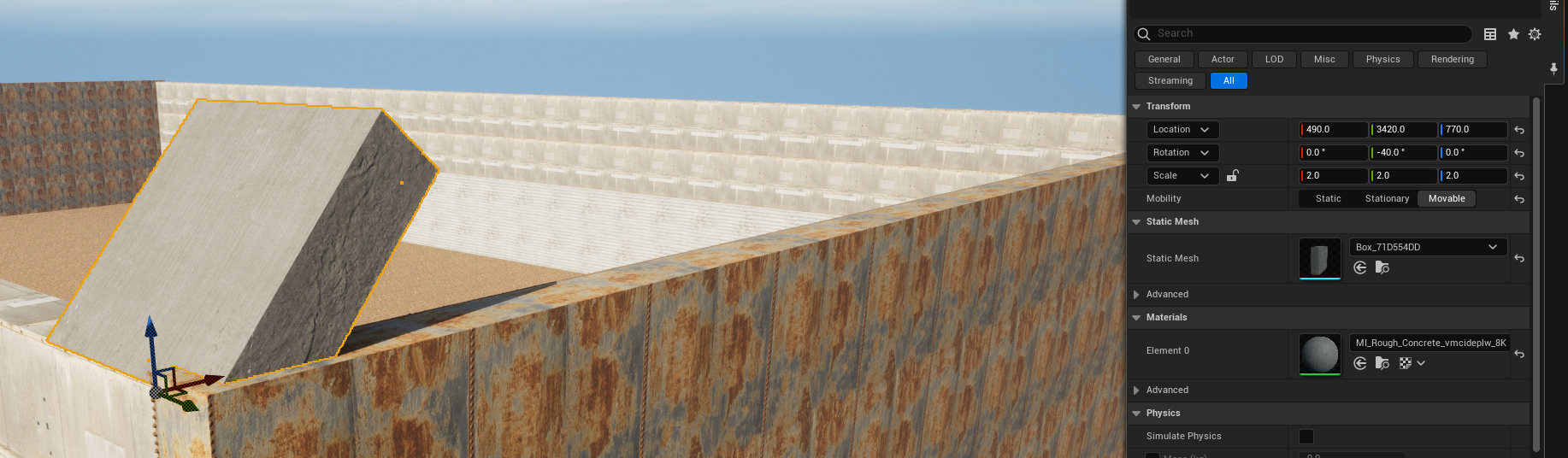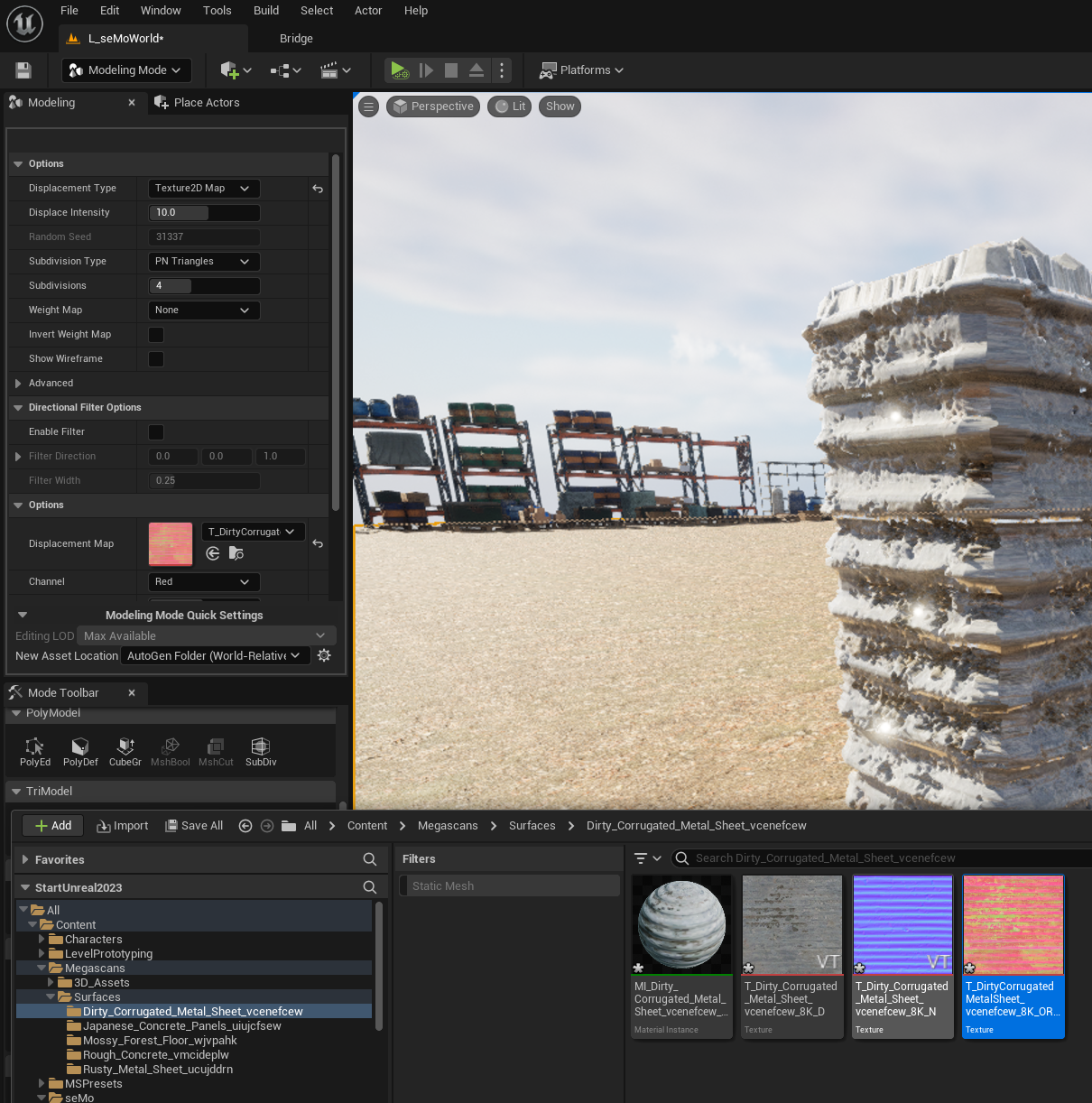 이제 만들어둔 에셋을 늘이고 복사하고 이어붙이며 공장 벽을 세울 수 있다. 하지만 여태까지 작업에서 주의해야 할 점은 ReMesh와 Displace 작업은 Static Mesh의 원본을 수정하게 된다. 따라서 Content Browser를 통해 에셋을 드래그하여 새로운 Actor를 배치한다 하더라도 우리가 수정하여 굴곡을 구현했던 그 모습 그대로의 Actor가 배치된다.