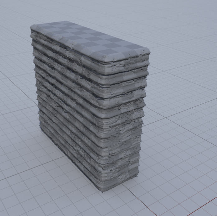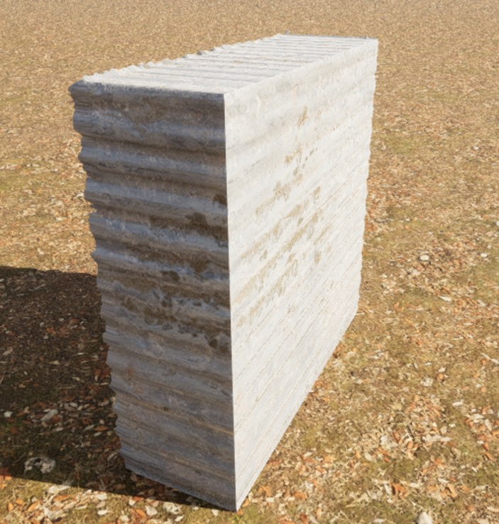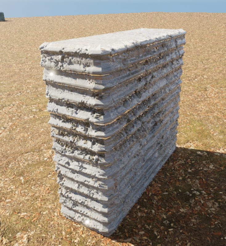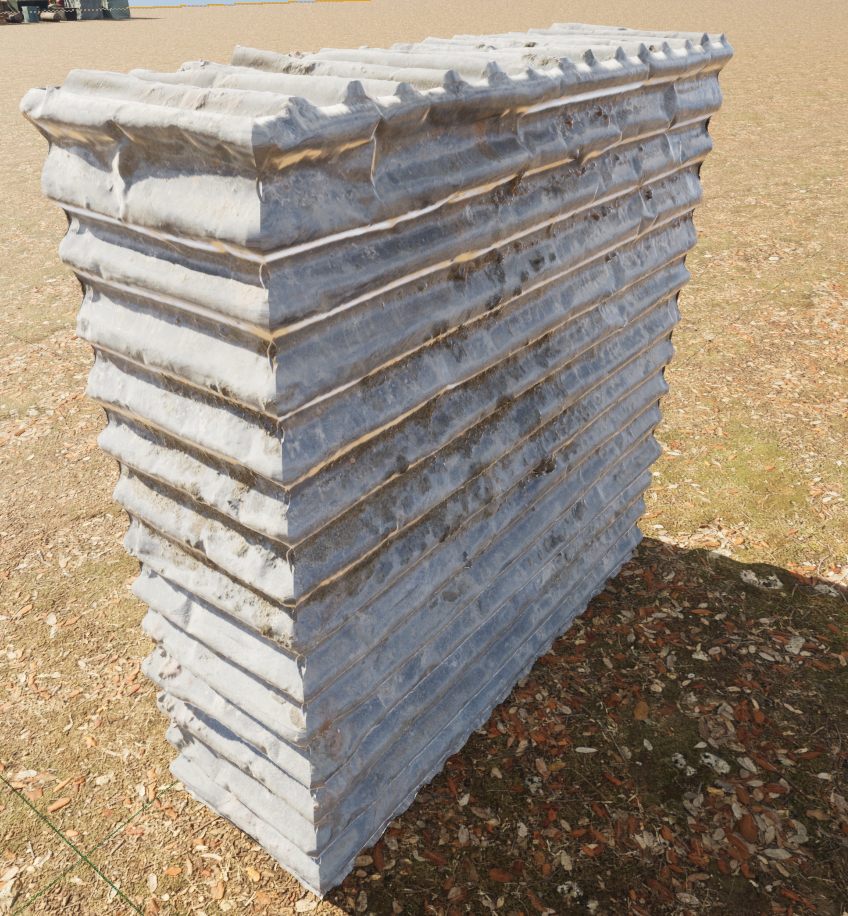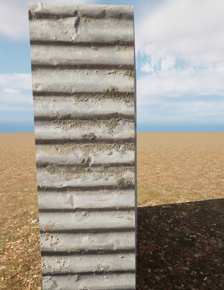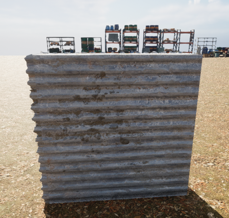 질감표현은 아주 잘 됐으나, 굴곡표현은 결국 착시를 이용하여 구현했기 때문에 오른쪽 사진을 보면 보이다시피 실제 굴곡은 없는 그냥 상자형태이다. 이 부분은 상자모양의 표현 한계를 넘어서지 못해 조금 아쉬운데, UE5의 모델링 기능을 이용한다면 텍스쳐데이터의 정보로 실제 굴곡을 표현할 수 있게 된다.