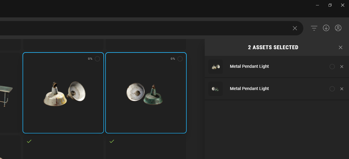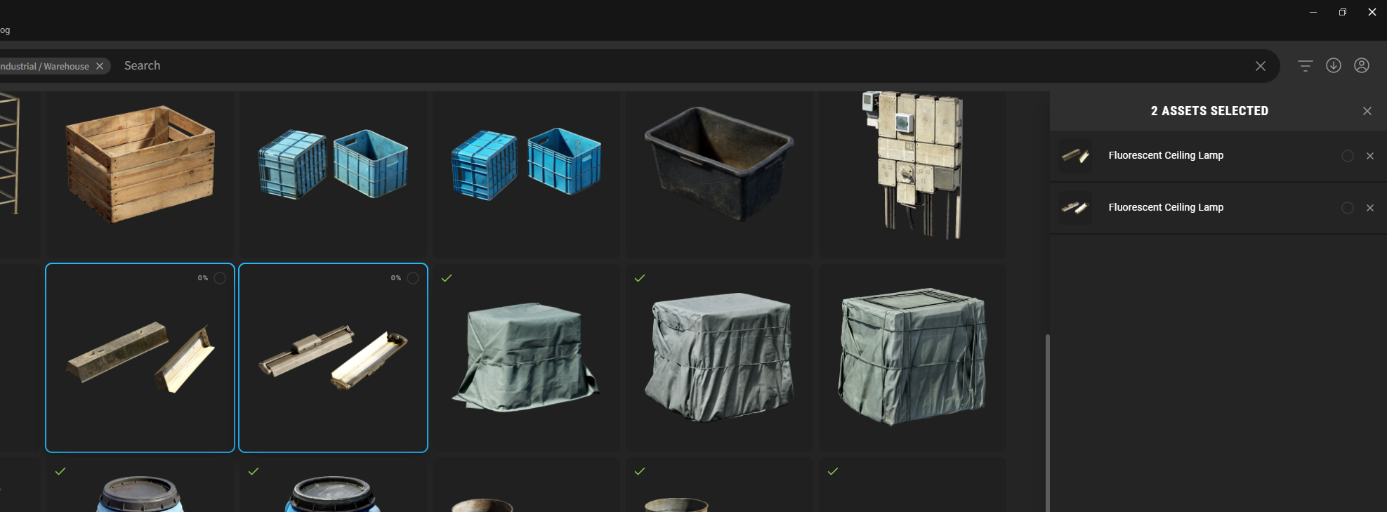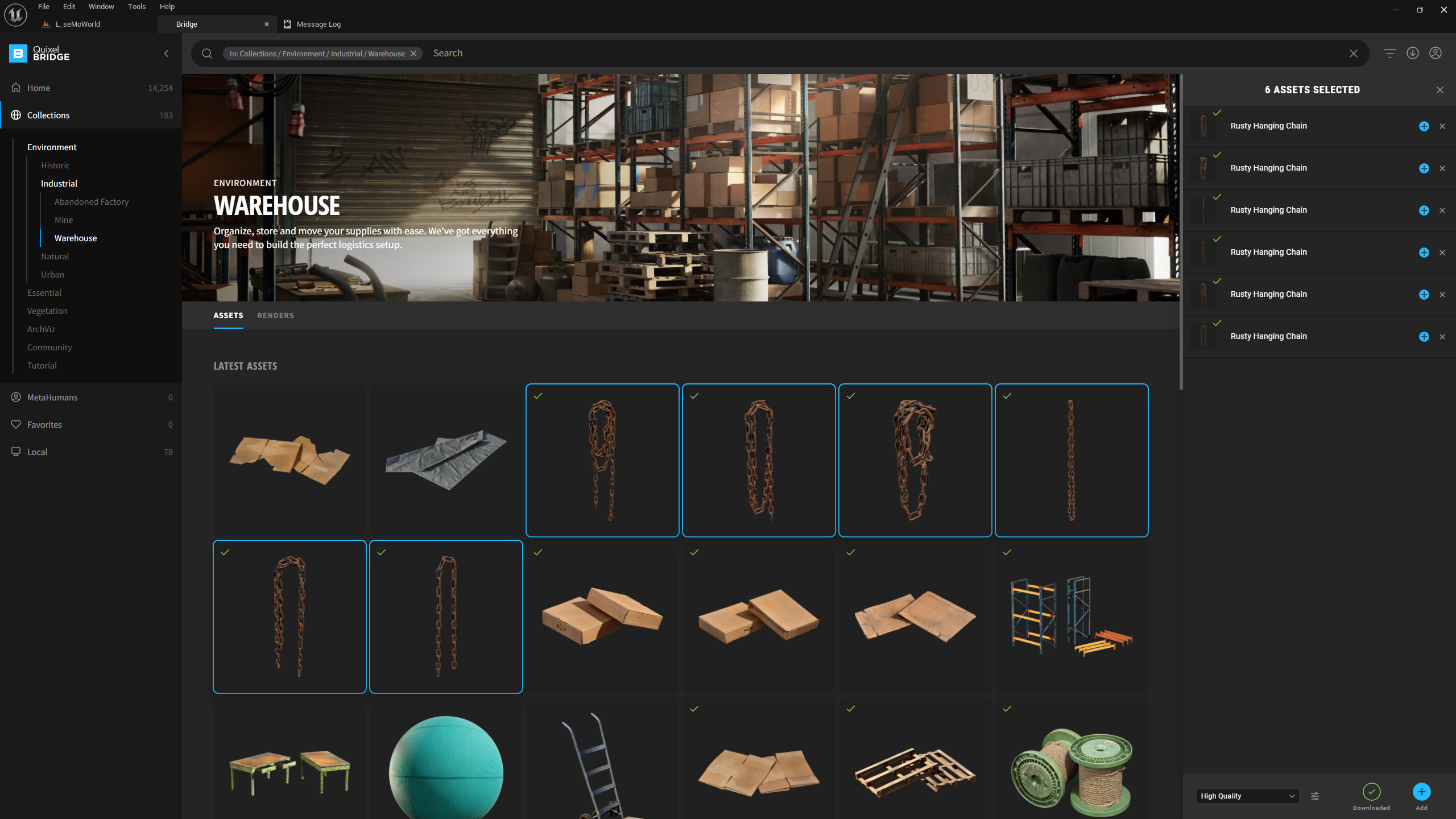 조명을 쇠사슬에 걸어 배치할 것이므로 Quixel Bridge > Collections 에서 Warehouse를 검색한 후 나오는 쇠사슬들을 다운받자.
