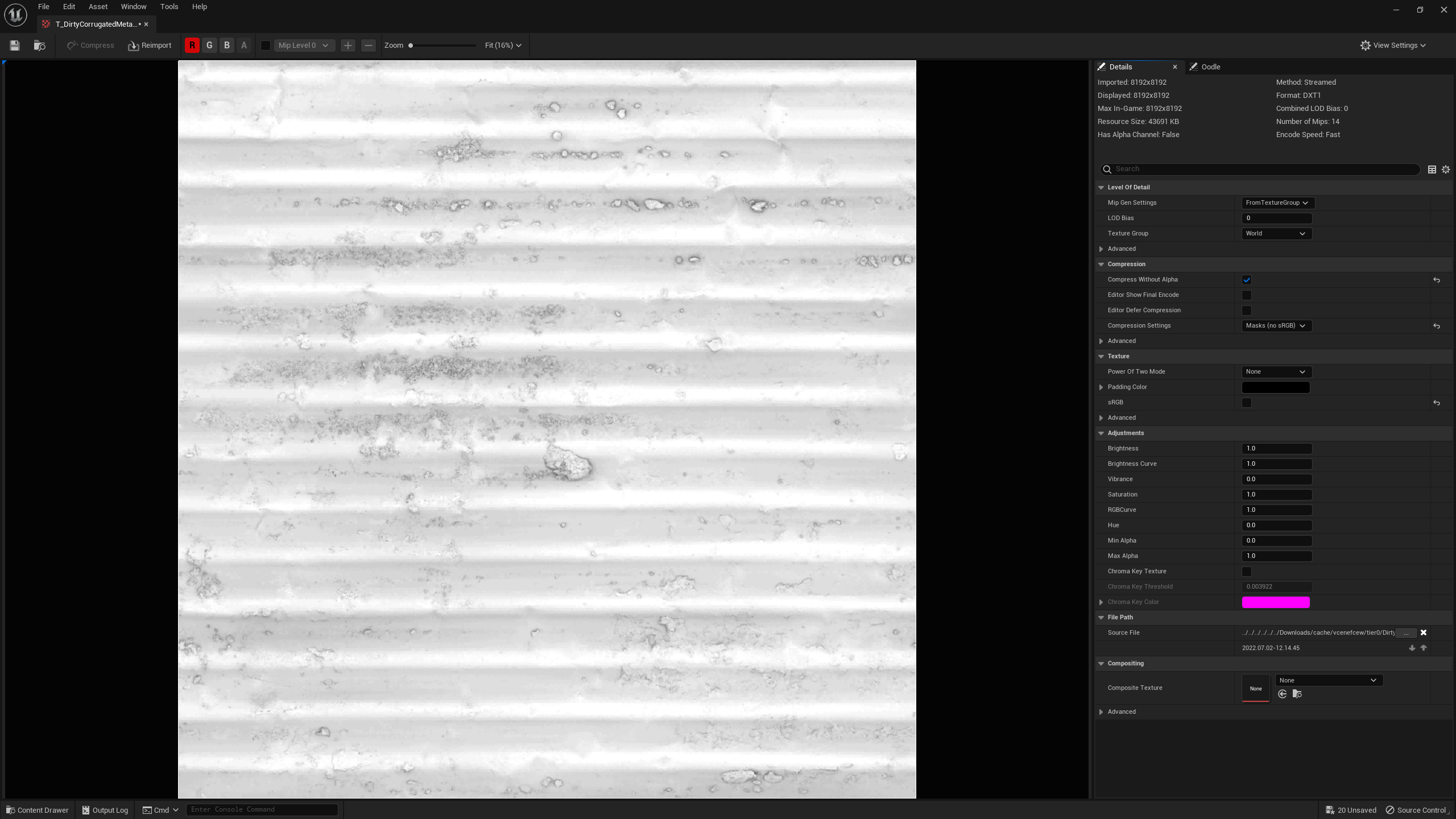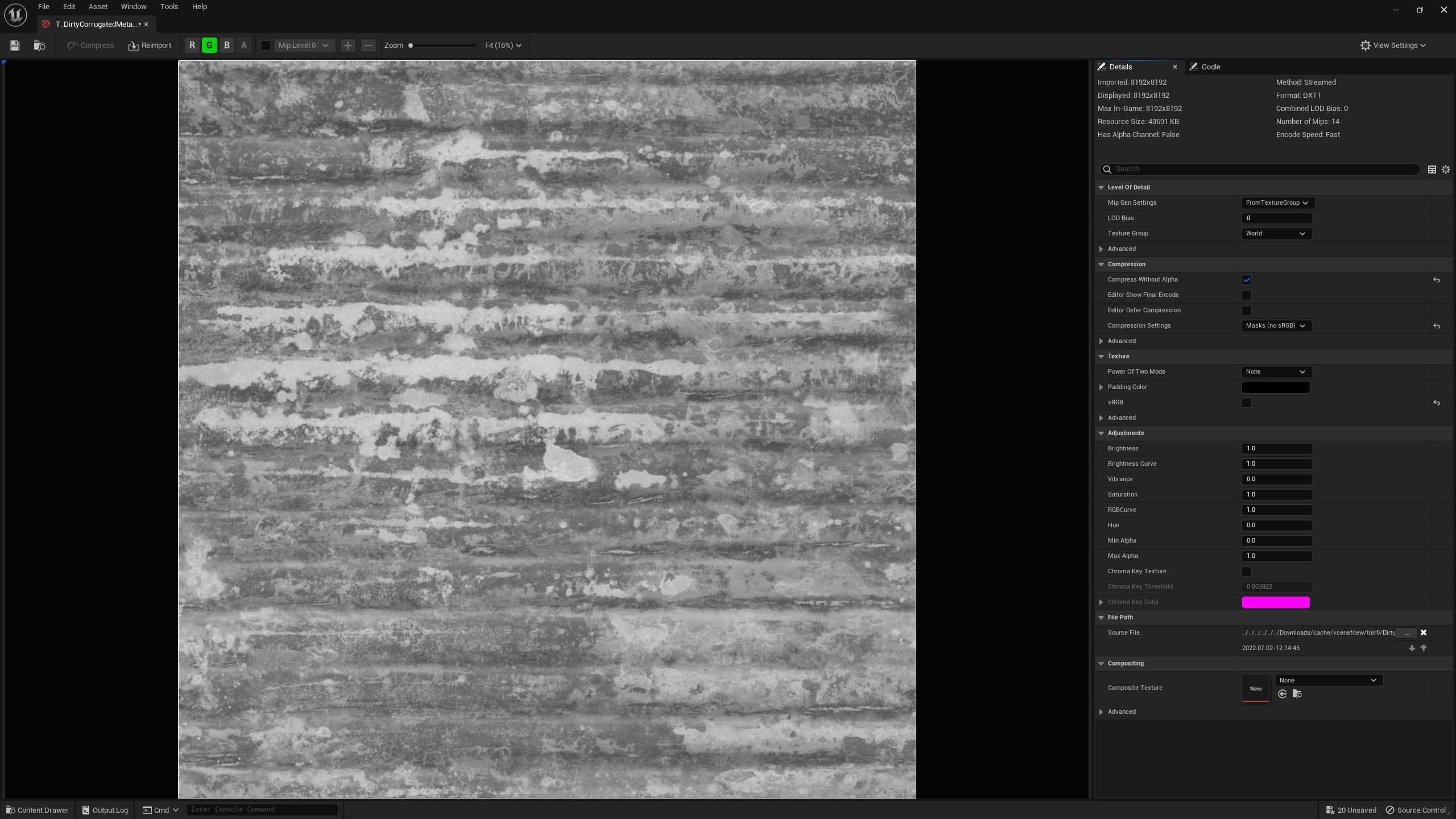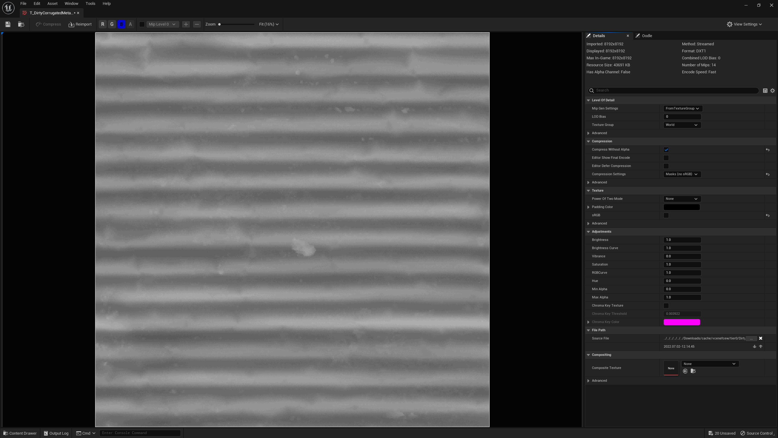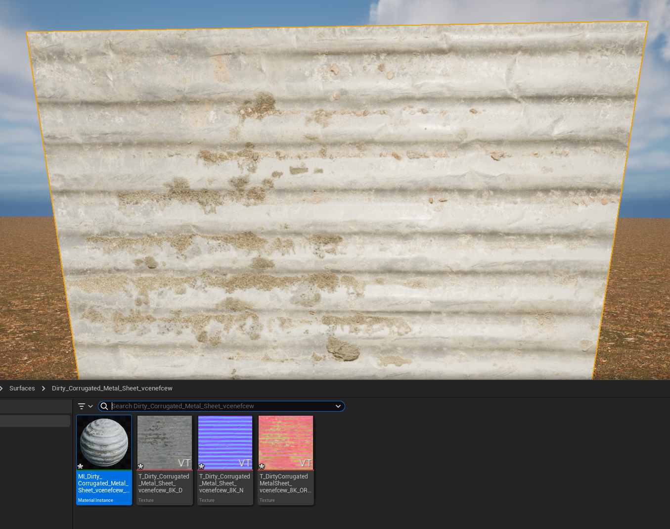Home > Surfaces 탭에서 Metal을 검색하여 Rusty Metal Sheet, Dirty Corrugated Metal Sheet, Japanese Concrete Panels를 다운받고, Concrete를 검색하여 Rough Concrete를 다운받았다. 다운을 받고 Add는 하지 않은 에셋들은 Local 탭에서 다운받은 순서대로 확인할 수 있다.